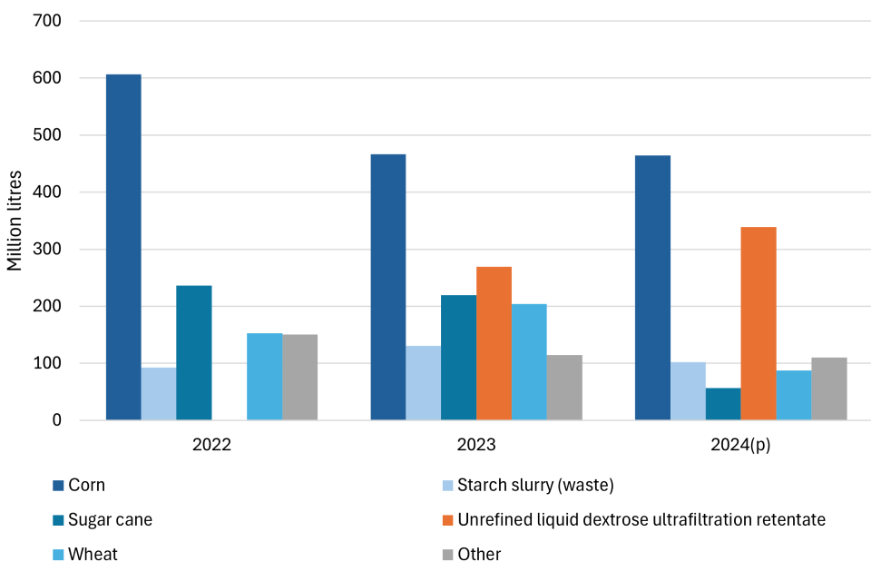 | Feedstock | 2022 in million litres | 2023 in million litres | 2024 in million litres (provisional) |