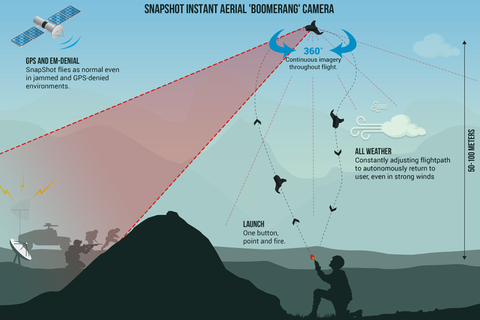 SnapShot is a fully autonomous system which can easily be deployed without additional equipment and will glide back to its user whatever the weather, winds or conditions – even in GPS denied and electromagnetically jammed environments.