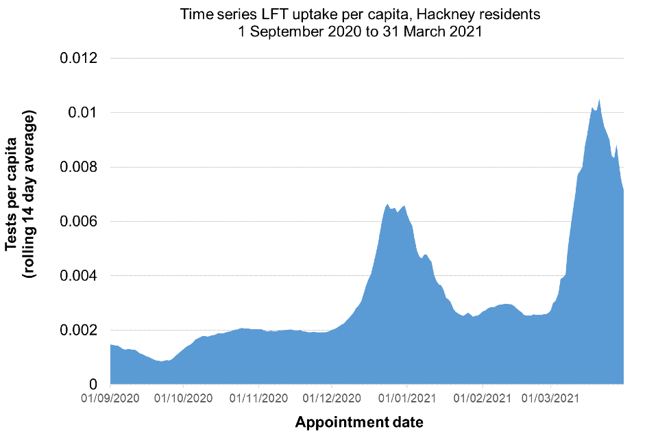 Figure 2. Time series LFT uptake per capita, Hackney residents, 1 September 2020 to 31 March 2021