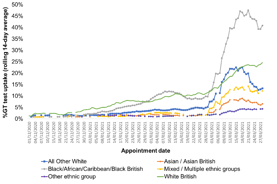 Figure 3. Time series LFT uptake by ethnicity for Hackney Wick residents (1 December 2020 to 28 March 2021)