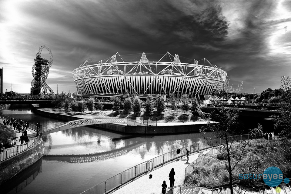 Black and white photo of the London Olympic Stadium