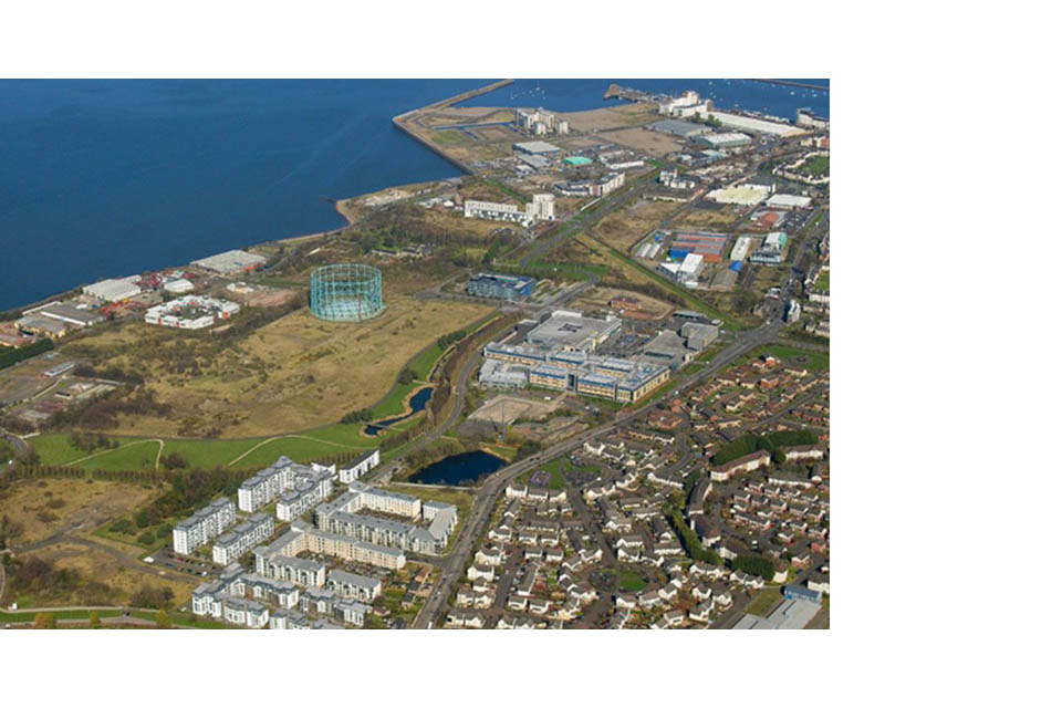 Aerial shot of the Granton Waterfront area in Edinburgh, showing the sea and the gasholder.