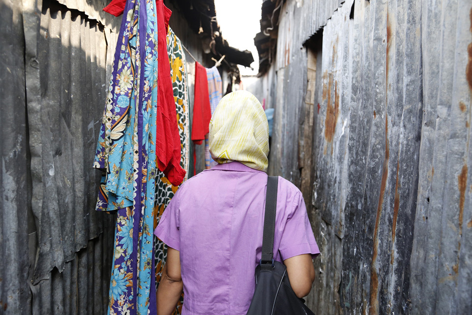 Community health worker Parveen visits a woman and her child in the Korail slum of Dhaka, Bangladesh. Picture: Ricci Coughlan/DFID