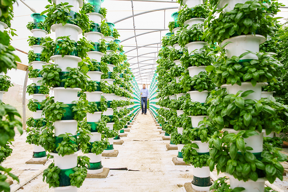 The vertical crop arrangement allows for 3 to 4 times the crop yield in the same space.