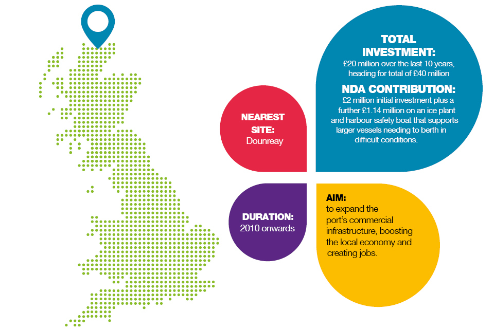| Dounreay | 2010 onwards | £20 million over the last 10 years, heading for total of £40 million | £2 million initial investment plus a further £1.14 million on an ice plant and harbour safety boat that supports larger vessels needing to berth in difficult conditions. | Scrabster Harbour Trust, Caithness and North Sutherland Regeneration Partnership, Highlands and Islands Enterprise, and Scottish Government (through both ERDF and EFF funds) | Scrabster Harbour Trust |