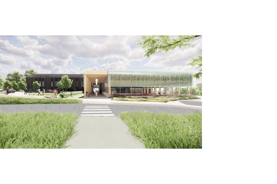 Mock-up of the planned Outer West Leisure Centre, showing the entrance by the roadside