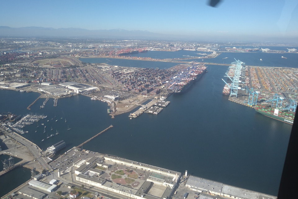 Flying over the Port of LA, the busiest container port in North America and one of the 10 busiest globally. Over 9 million containers are processed each year into and out of the US through this node. (Photo credit: Stuart Lyle)