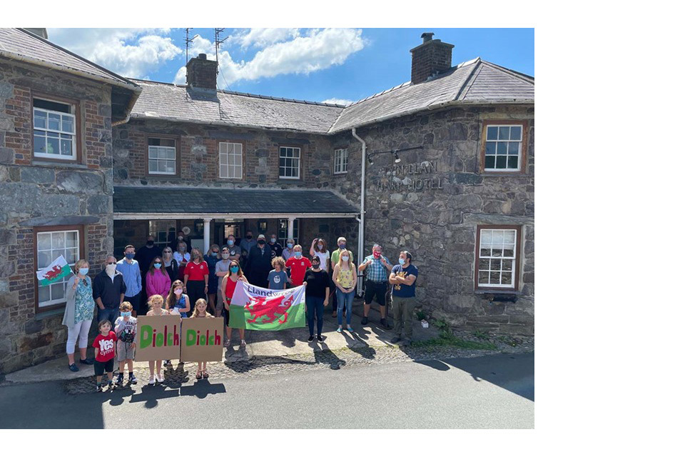 Members of the community and local volunteers gathered outside the Ty’n Llan pub entrance with banners and signs
