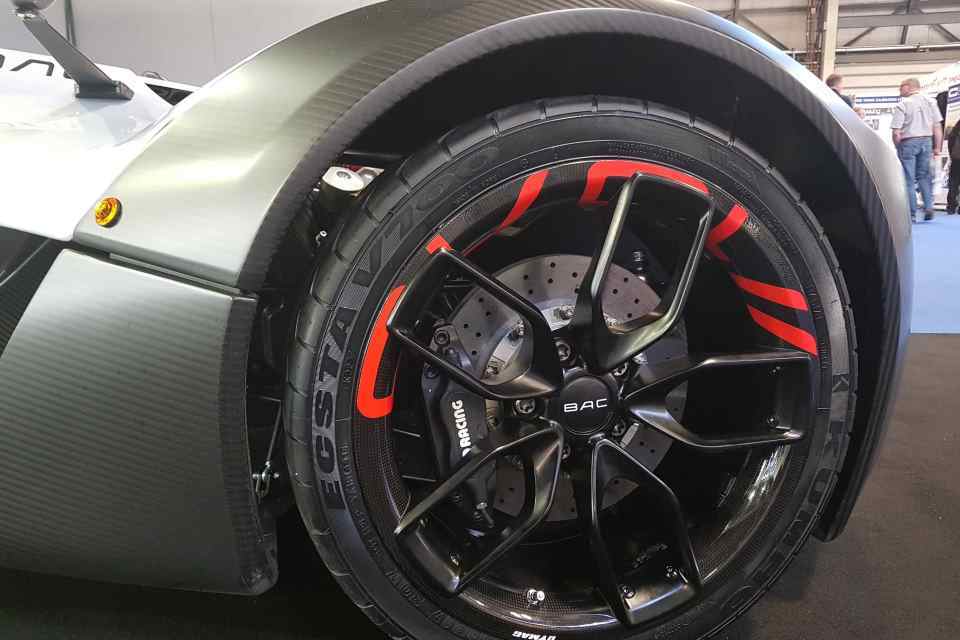 A carbon-ceramic brake disc system on a 170mph BAC Mono single-seater.