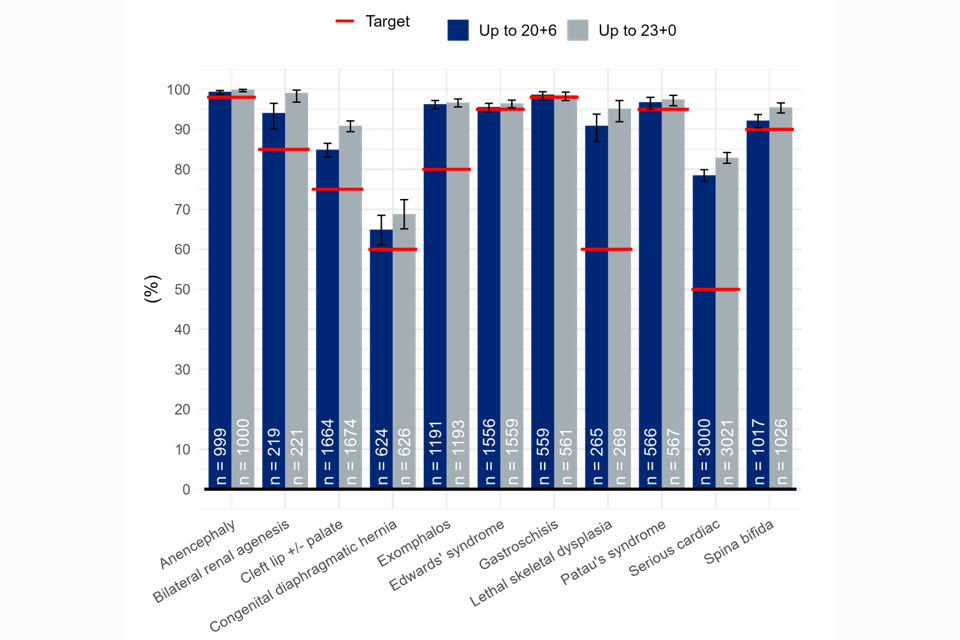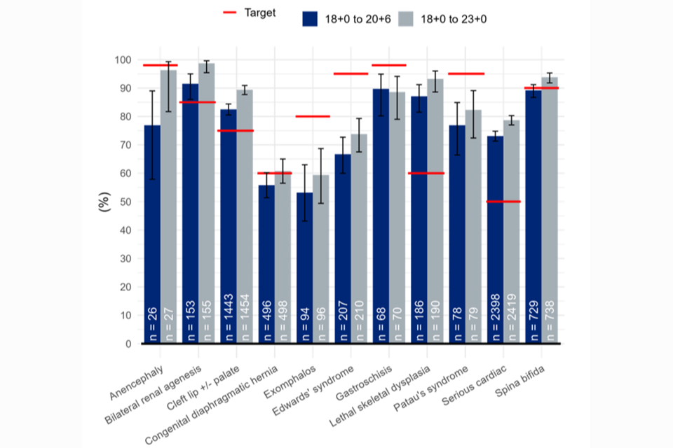The 20-week screening scan – NHS FASP has a target DR of 95% for T18 and T13. Table 1 shows the DRs for T18 and T13 using data from NCARDRS for pregnancies with an expected date of delivery (EDD) 1 April 2019 to 31 March 2020.