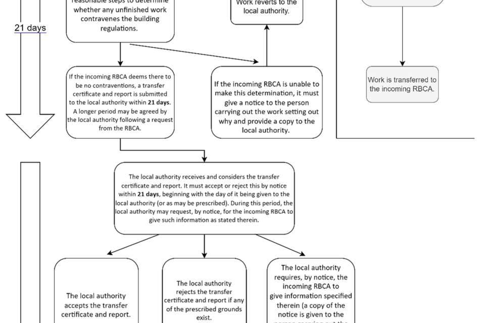 22. Where an initial notice has been submitted or full plans have been deposited before the new regime for higher-risk building work comes into force, but work is not commenced within a transition period set out in law, we proposed to provide in regulations that the higher-risk buildings overseen by both a local authority and an approved inspector would be transferred to the jurisdiction of the Building Safety Regulator once the transition period has elapsed. The process outlined in paragraph 12.17 of the aforementioned consultation would then apply.