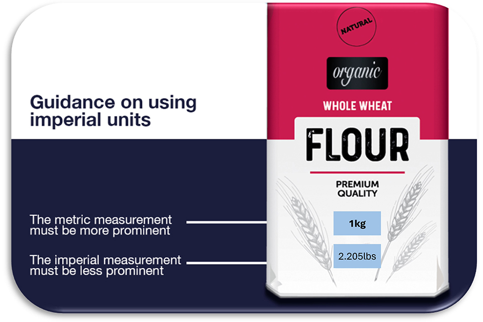 7) You can voluntarily choose to use imperial units when selling packaged or loose goods in the UK. You must also display a metric measurement alongside. The imperial measurement must be less prominent than the metric measurement and must be expressed in characters no larger than the metric indicator.