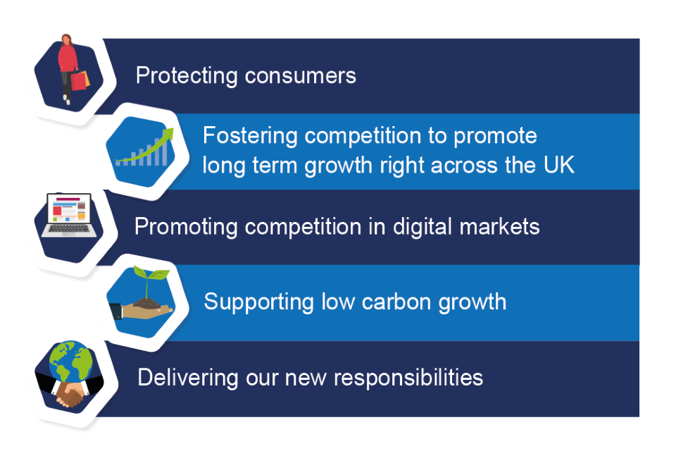 The image above shows our key themes as follows: Protecting Consumers; Fostering competition to promote long term growth right across the UK; Promoting competition in digital markets; Supporting low carbon growth; Delivering our new responsibilities.