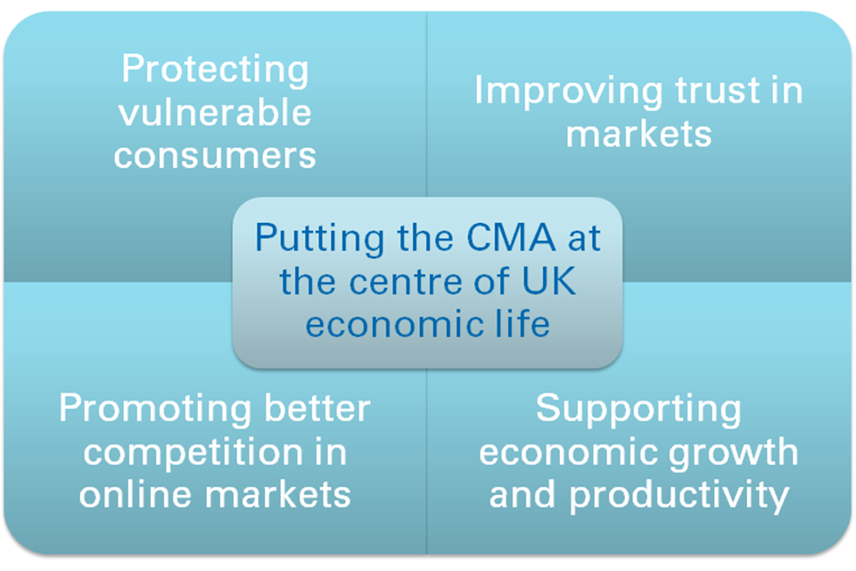Putting the CMA at the centre of UK economic life: protecting vulnerable consumers, improving trust in markets, promoting better competition in online markets, supporting economic growth and productivity
