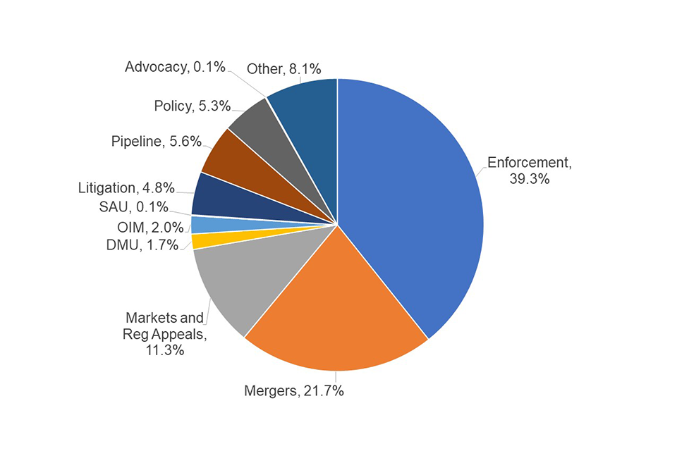 Image description: Pie chart showing distribution of CMA staff time from October 2020-September 2021 Text shows that the distribution was 39.3% enforcement, 21.7% mergers, 11.3% markets and regulatory appeals, 5.6% pipeline, 5.3% policy, 4.8% litigation, 2% OIM, 1.7% DMU, 0.1% SAU, 0.1% advocacy and 8.1% other.