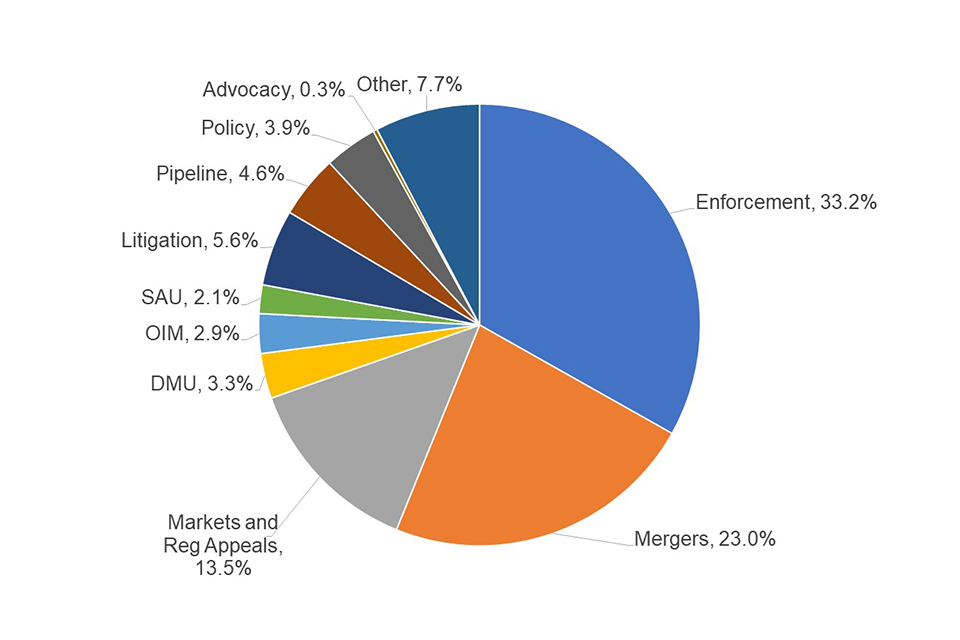 Image description: Pie chart showing distribution of CMA staff time from October 2021-September 2022, text shows that the distribution was 33.2% enforcement, 23% mergers, 13.5% markets and regulatory appeals, 4.6% pipeline, 3.9% policy, 5.6% litigation, 3.3% DMU, 2.9% OIM, 2.1% SAU, 0.3% advocacy and 7.7% other.