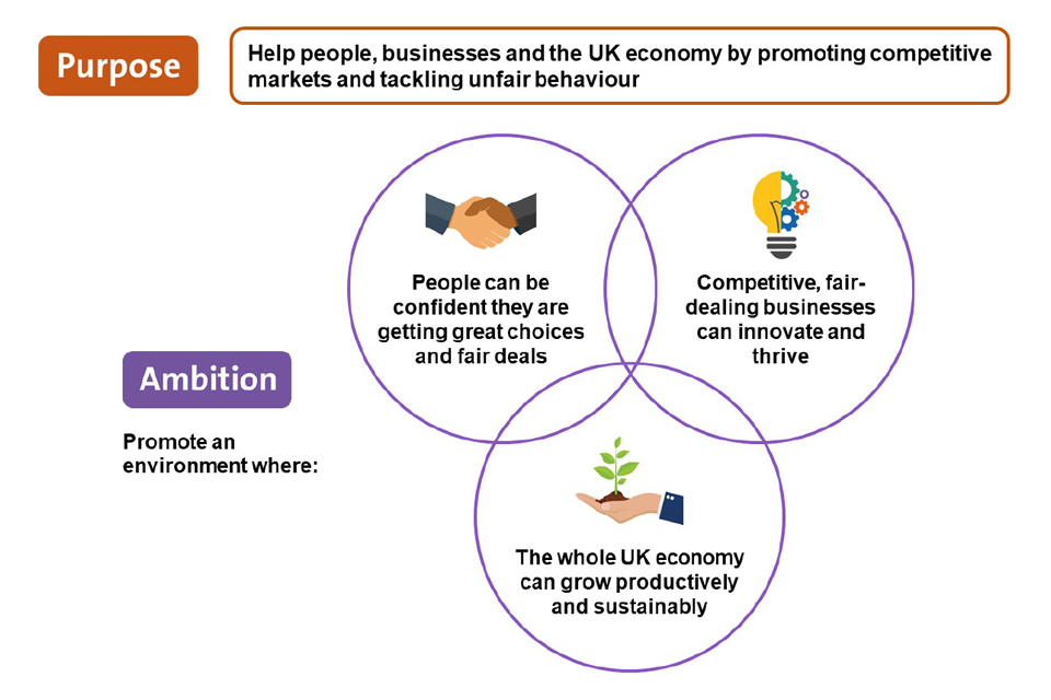 Image description: Figure detailing the CMA’s purpose and ambition. Text reads: Purpose, Help people, businesses and the UK economy by promoting competitive markets and tackling unfair behaviour.