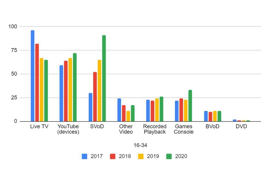 20. C4C attracts a large share of viewing amongst 16-34-year-olds, achieving a portfolio viewing share of 15.7% in 2020, 55% higher than its corresponding all-audience share of 10.1%.[footnote 7] Young audiences in particular are turning to alternative platforms to access content with 16-34 year olds watching 65 minutes of live TV per day in 2020, down from 96 minutes in 2017 (Figure 1). Meanwhile, SVoD viewing tripled in that time with 16-34 year olds watching 91 minutes of SVoD content per day in 2020, up from 30 minutes in 2017. They also watched an average of 72 minutes of YouTube each day in 2020, up from 59 minutes in 2017.[footnote 8] In order to retain this key audience, it is therefore essential that C4C accelerates its transformation into a hybrid broadcaster with both linear and VoD offerings across multiple platforms, a transition that could require significant investment and which is made more difficult by C4C’s existing ownership model and lack of access to capital.