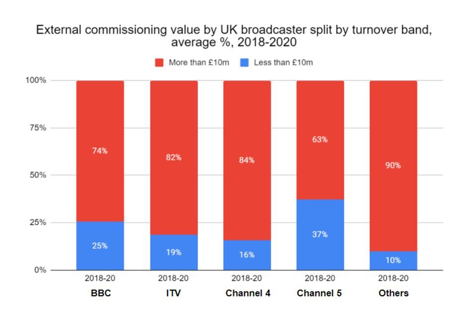 49. The government expects the buyer of C4C will recognise and value the strong local relationships C4C has with the independent production sector, and therefore is likely to wish to maintain and nurture these as a key driver of growth and differentiation. EY analysis, commissioned by C4C, suggests that ending the publisher-broadcaster model may result in a reduction in revenues from primary commissions for small and medium producers by up to 16%.[footnote 38] The government disagrees with this assessment in terms of investment in SMEs - only 16% of C4C’s average external commissioning spend between 2018 and 2020 was with producers with turnover up to £10m (Figure 5), less than the BBC, ITV and Channel 5,[footnote 39] suggesting that private ownership does not necessarily lead to decreased investment in SME companies. There may be some individual firms that lose out under private ownership if C4C narrows the pool of producers it works with, but those continuing to receive investment may benefit if C4C increases its investment in absolute terms.