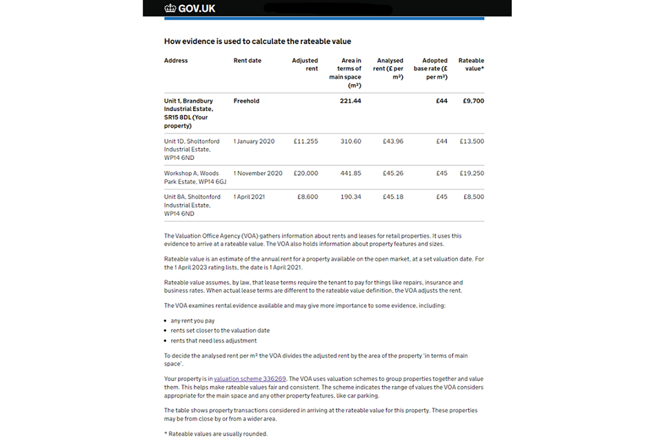 | Address | Rent date | Adjusted rent | Area in terms of main space (m2) | Analysed rent (£ per m2) | Adopted base rate (£ per m2) | Rateable value* |