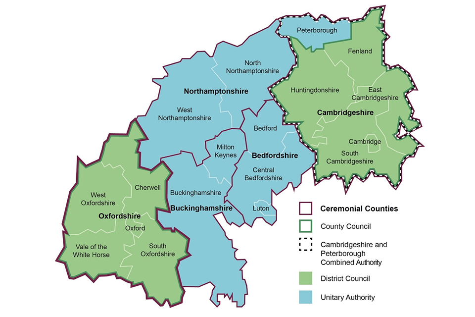 Map of the Oxford-Cambridge Arc area showing key administrative boundaries including: Ceremonial Counties; City Councils; Combined Authorities; District Councils; and Unitary Authority areas.