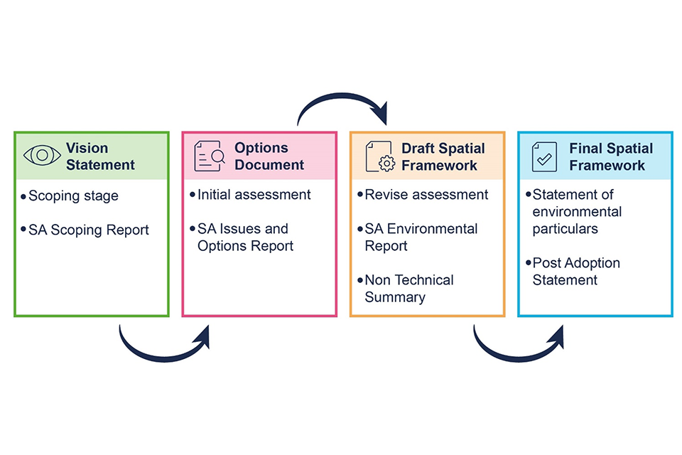 The Sustainability Assessment stages intended for the Spatial Framework, including the Vision Statement, Options Document, Draft Spatial Framework and Final Spatial Framework.