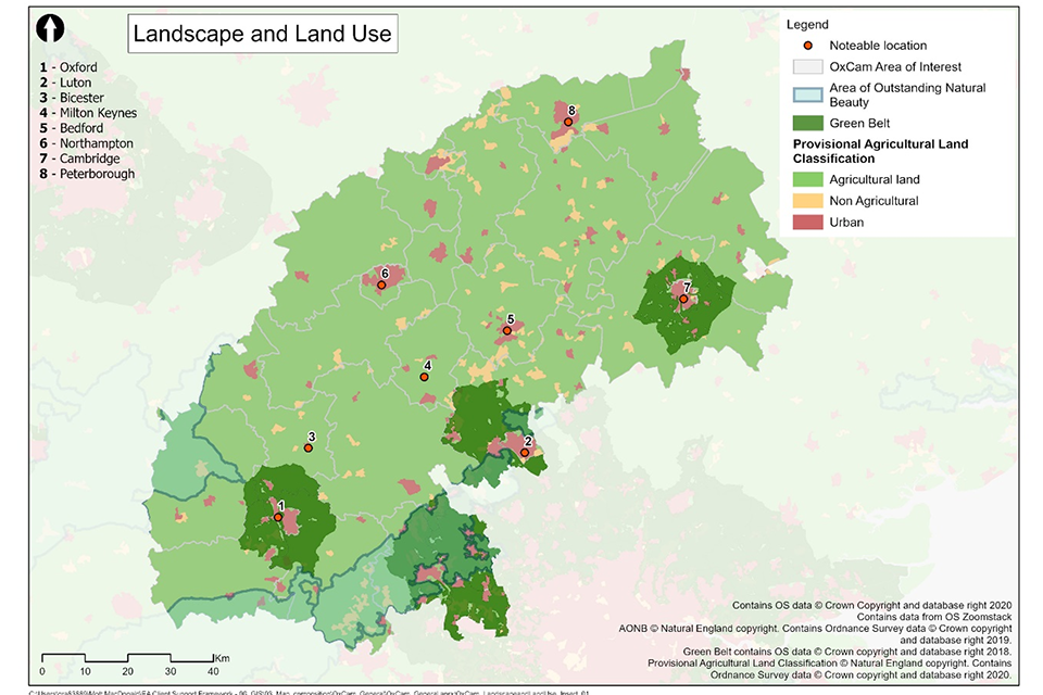 Map showing three AONBs, eight urban centres and areas of green belt, principally around Oxford, Luton and Cambridge.