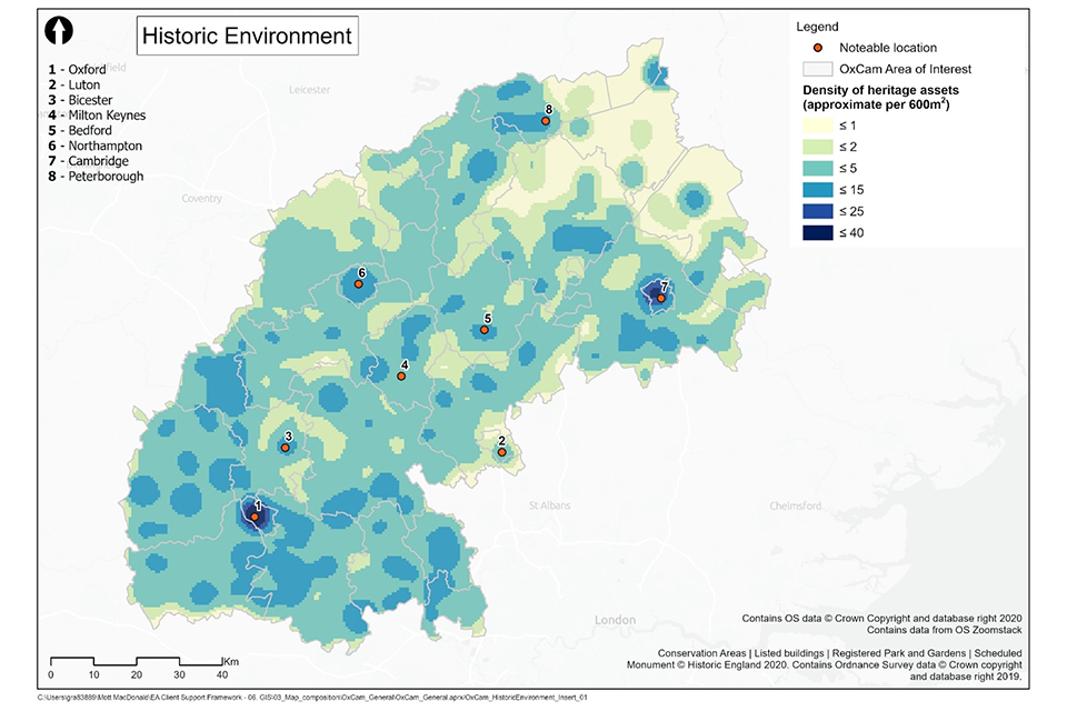 Concentration of heritage assets across the Arc. The map shows concentrations of heritage assets around Oxford, Oxfordshire and Cambridge.