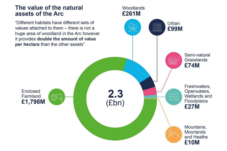 Example outputs from the Local Natural Capital Plan. The value of the natural assets of the Arc is approximately £2.3 billion.