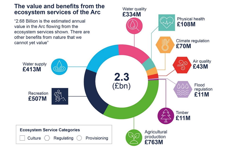 Example outputs from the Local Natural Capital Plan. £2.68 billion is the estimated annual value in the Arc flowing from ecosystem services.