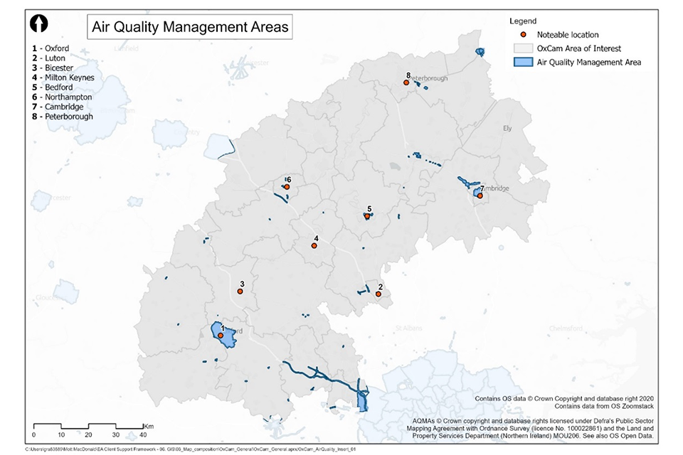 4.27 Current road traffic in urban centres and on the strategic road network is the primary source of harmful emissions leading to air quality problems within the Arc. Exposure to air pollution represents one of the most significant environmental threats to health in the UK, with thousands of deaths a year being attributed to long-term exposure. Air Quality Management Areas (AQMAs) are declared where local authorities consider that national air quality objectives are not likely to be achieved. There are over 50 AQMAs across the Arc, as shown in Figure 4.7; the principal locations are: