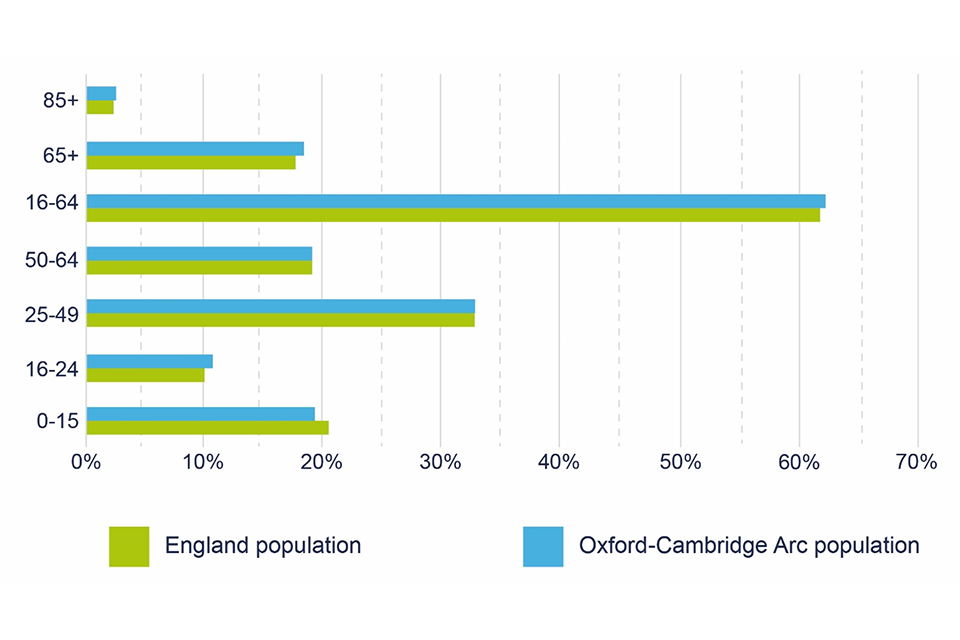 4.17 The main population centres are across the core of the Arc, including Oxford, Bicester, Milton Keynes, Bedford and Cambridge as well as Luton and Peterborough in the north and south. The Arc has a total population of approximately 3.7 million people; this has grown from approximately 2.8 million in 1991 and is expected to increase to close to 4 million by 2043. The population in the Arc is supported by a steady flow of national (internal) and international migration where 80% of the inflows into the area are from other places in the UK. The areas experiencing the largest increases in population from international migration are Northampton, Luton and Oxford. The current and projected age profile of the Arc population is shown in Figures 4.5 and 4.6.