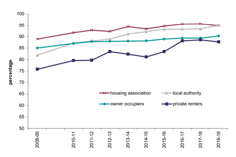 Chart 1: Households with at least one working smoke alarm by tenure 2008-09 to 2018-19