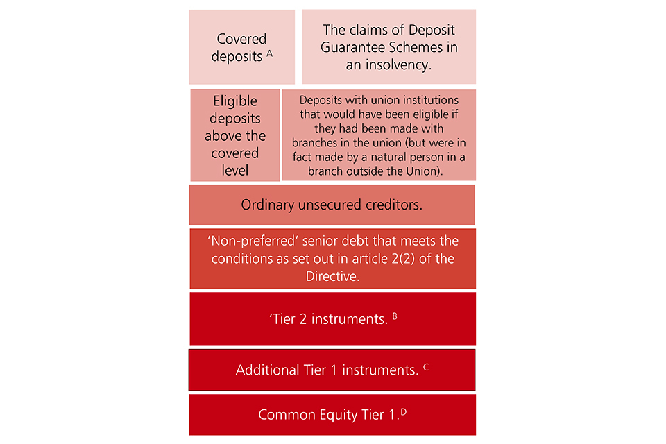 Notes: A - The coverage level provided for in Article 6 of Directive 2014/49/EU. In the UK, the FSCS guarantees eligible deposits up to £85,000. B, C, D - These capital instruments are referred to in points (a) to (c) of Article 48(1) of the BRRD.