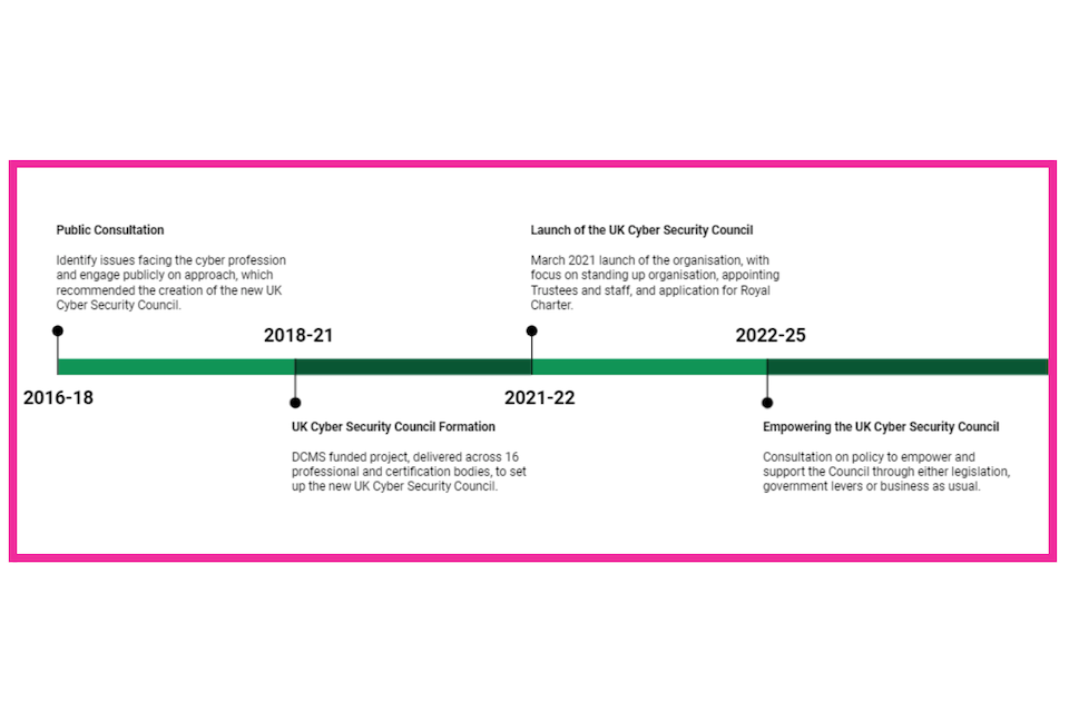 The first consideration is around the need for government intervention, beyond continuation of initial support to ensure that the UK Cyber Security Council stands up and establishes itself as a sustainable and credible organisation over the next strategic period. The government is supporting the Council with: