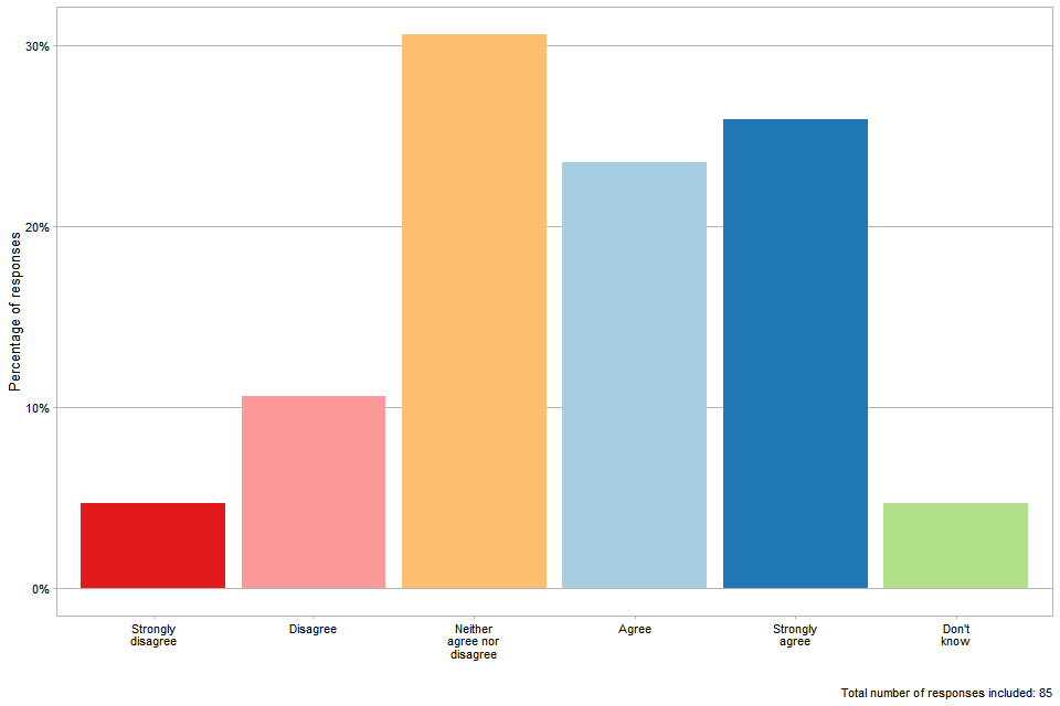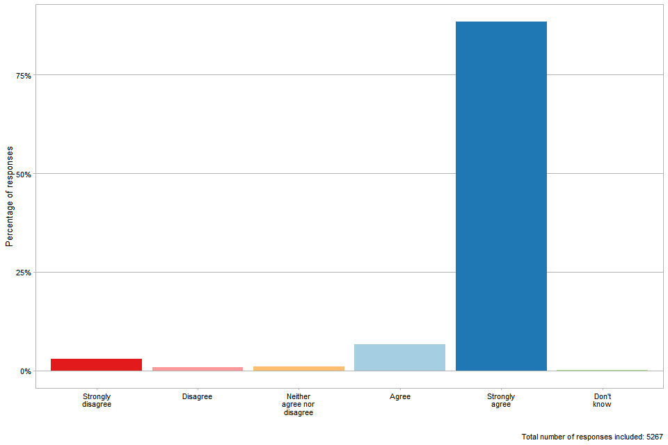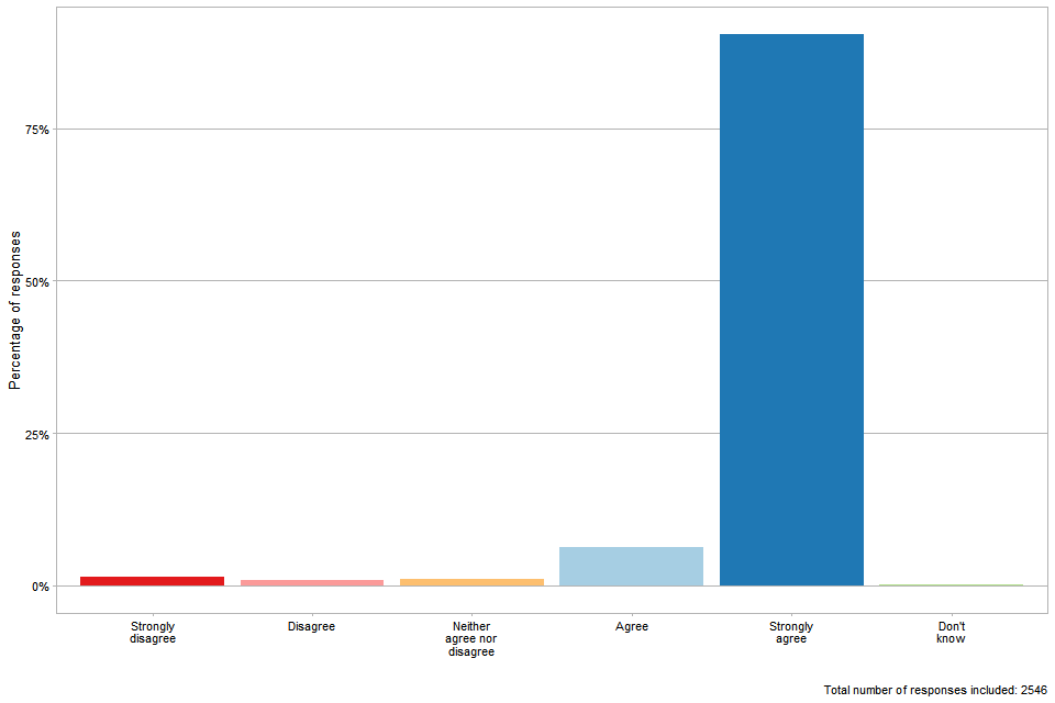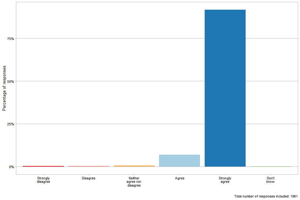 The vast majority (88%) of the responses to this question were from respondents from the health and care sector who have been in receipt of free PPE. Of these respondents, nearly all (96%) agreed or strongly agreed that free PPE should be extended.
