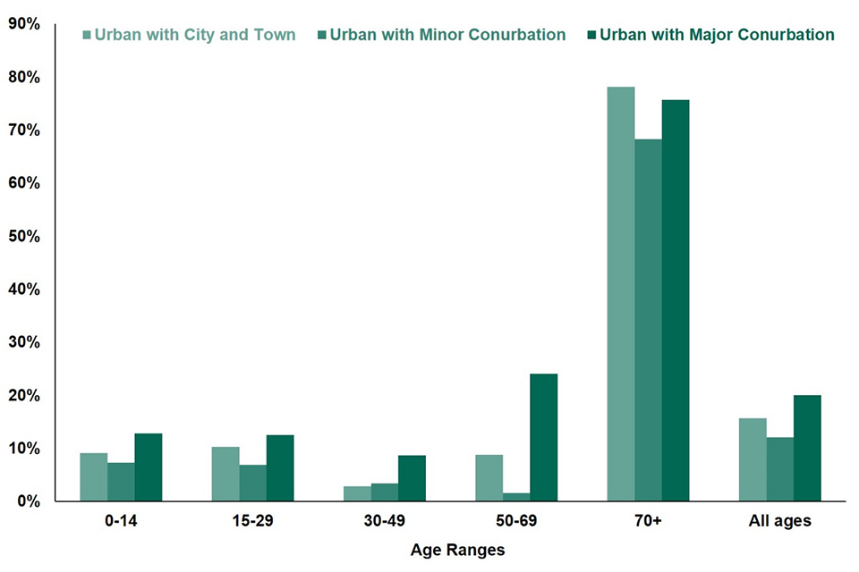 Figure 1: Projected percentage increase in population of predominantly urban areas in England between 2014 and 2039, by age group
