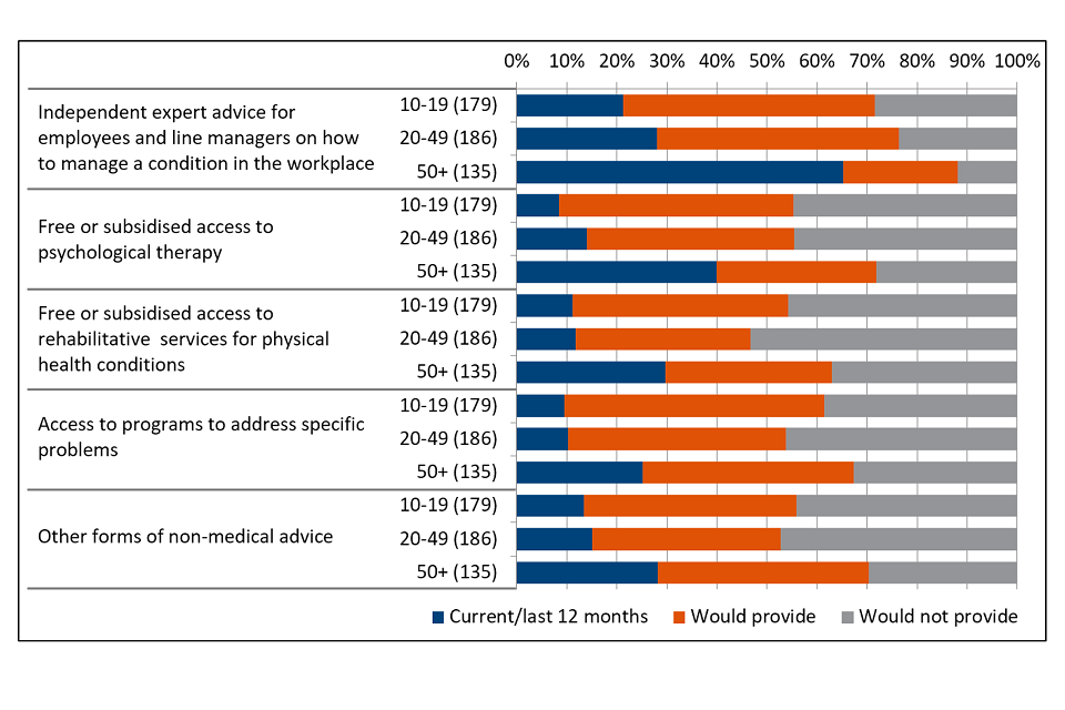 ‘Health is everyone’s business’ set out a number of proposals to minimise the risk of ill-health related job loss. Prior to COVID-19, there were around 12.7m working-age people with a long-term health condition, including 7.6m disabled people whose condition reduces their ability to carry out day to day activities.[footnote 18] Over the course of a year, around 1.4m working-age people had at least one sickness absence lasting four weeks or longer.[footnote 19] The likelihood of a return to work reduces the longer the individual experiences sickness absence.[footnote 20] Disabled people were 10 times more likely to have a spell of long-term sickness absence (LTSA) and leave work following it than non-disabled people.[footnote 21] The research is clear. Early and sustained support by employers, including workplace adjustments, is an effective way to minimise the risk of ill-health related job loss. Employers agree there is a strong link between work and health; however, there is significant variation in the level of support offered by employers.[footnote 22][footnote 23] Those who have experienced incidences of disability or long-term sickness absence in their workforce are more likely to have support mechanisms in place; larger employers are more likely to have dedicated HR support as well as access to formal health and wellbeing services such as OH.