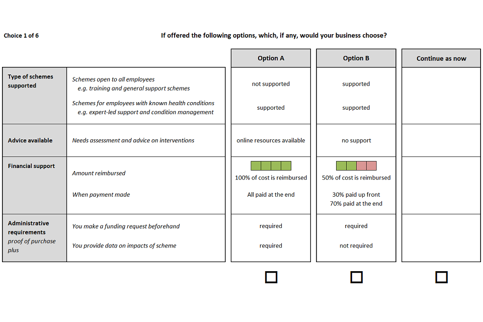 The choice experiment tested whether supplementary advice and guidance would increase take-up of a scheme. This was described as an upfront needs assessment to help SMEs better understand staff health needs or on how to source or implement best-practice schemes to address those needs. The experiment varied whether this advice was delivered through access to online resources or access to a personal adviser.