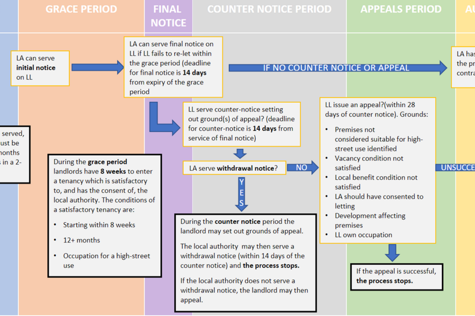 - once the local authority has served a notice of intent to carry out the High Street Rental Auction process, there will be a grace period of 8 weeks for the landlord to demonstrate they have let their property successfully by showing a completed letting agreement for a period of at least one year for a high street use