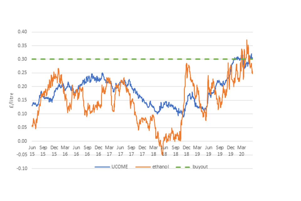 Chart with daily mid-point UCOME and ethanol biofuel costs from 9 June 2015 to 9 June 2020 and 30p constant buyout cost. Since August 2019 the spread between fossil fuel and biodiesel prices has risen and exceeded the buyout price several times.