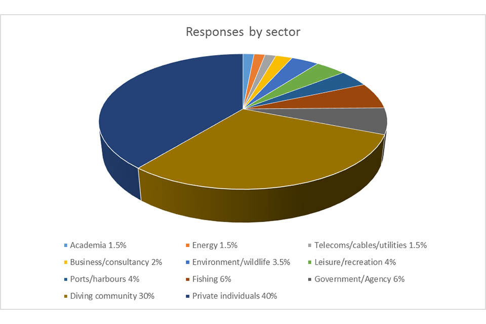 Responses by sector: Academia 1.5%, Energy 1.5%, Telecoms/cables/utilities 1.5%, Business/consultancy 2%, Environment/wildlife 3.5%, Leisure/recreation 4%, Ports/harbours 4%, Fishing 6%, Government/Agency 6%, Diving Community 30%, Private individuals 40%.