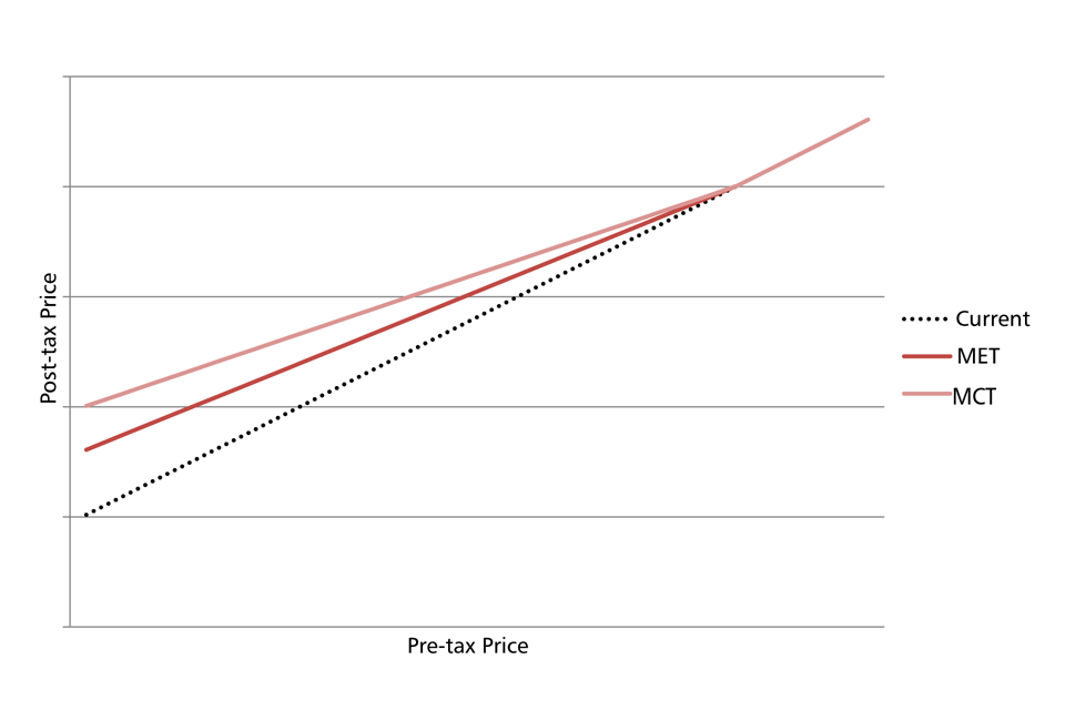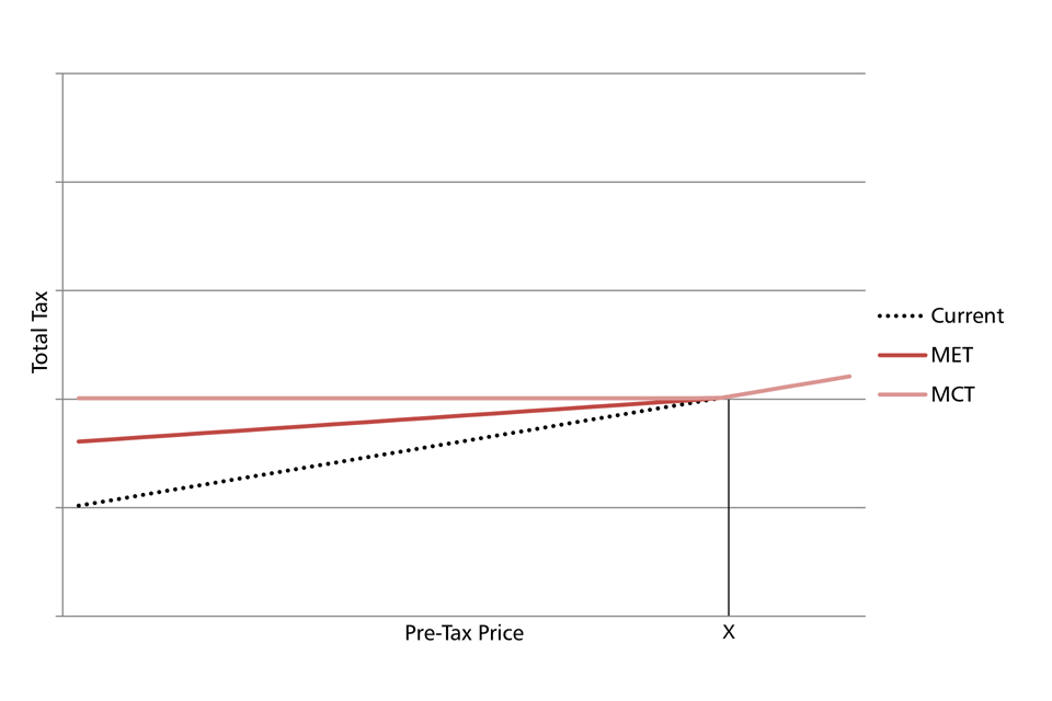 The dotted “current” line shows the current total tax (duty plus VAT) on a packet of cigarettes, in the absence of any “trigger point” level of MET or MCT. It is upward sloping. Because the ad valorem and VAT tax liabilities increase as price increases, pre-tax prices and the total tax levels are positively related.