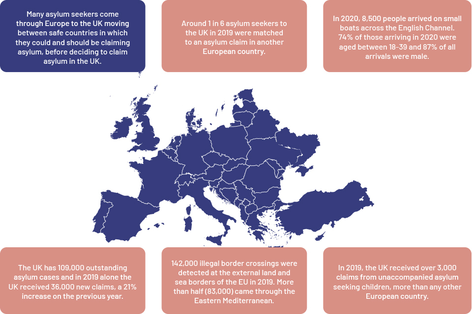 Many asylum seekers arrive via safe countries. Some match a claim elsewhere. In 2020 8500 people arrived on small boats. 142000 illegal border crossings were detected in the EU in 2019. In 2019 the UK received over 3000 claims from unaccompanied children