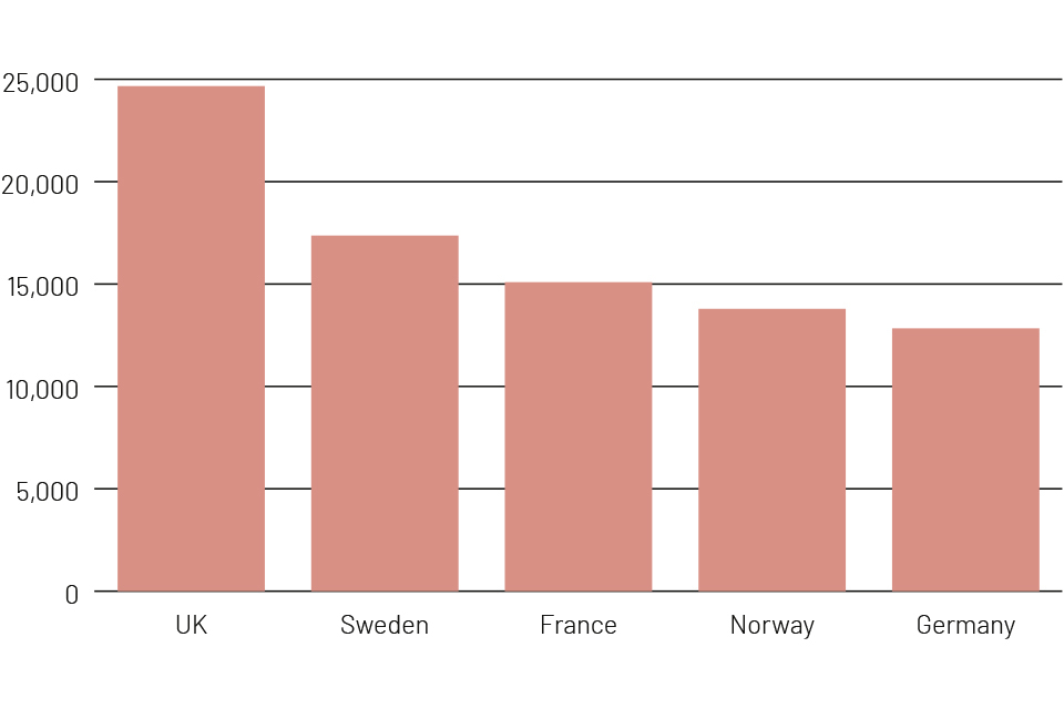 UK nearly 25000, Sweden 17500, France 15000, Norway 14000, Germany 13000