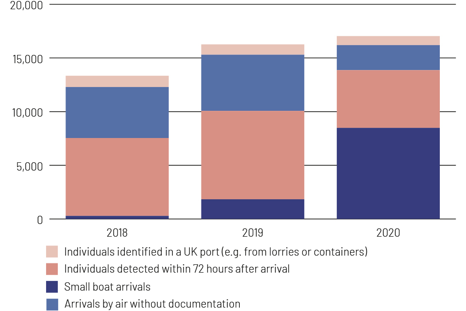 Detected irregular arrivals to the UK, by mode of entry, January 2018 to December 2020