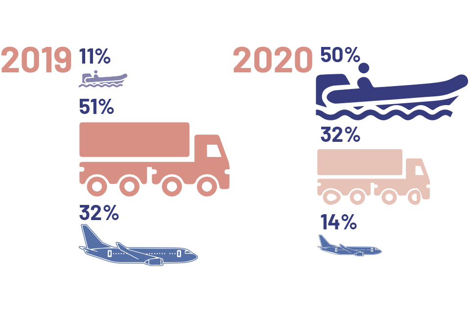 2019: small boats 11%, lorries 51%, air 32%. 2020 small boats 50%, lorries 32%, air 14%