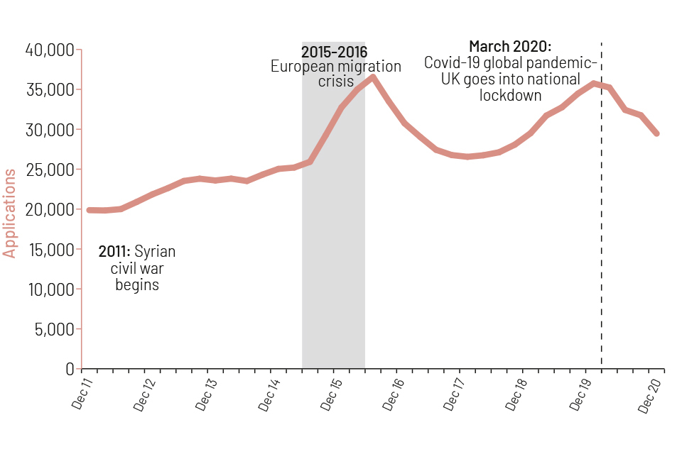 Before the Covid-19 pandemic began, asylum applications were rising – increasing by 35% between 2017 and 2019.
