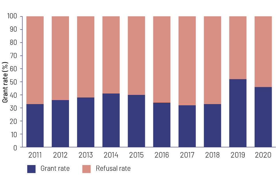 initial grant rate rose from 32% to 40% between 2011 and 2014, dropped to 30% by 2017, rose to over 50% by 2019 then fell to 45%