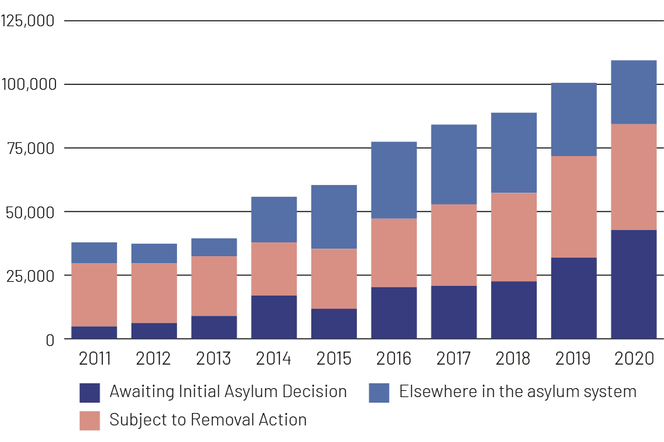 There are 109,000 asylum claims in the asylum system and the number of those awaiting initial decision rose to 52,000 by the end of 2020. Almost 73% of these claims have been in the asylum system for over one year.